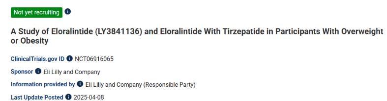 2025年4月8日,禮來在 ClinicalTrials 網(wǎng)站登記一項(xiàng) I 期臨床試驗(yàn),目的是在超重或肥胖的患者中評(píng)估長效胰淀素(Amylin)激動(dòng)劑 eloralintide 和 eloralintide 聯(lián)合替爾泊肽(tirzepatide)的耐受性以及副作用。研究藥物將通過皮下注射(SC)給藥。研究計(jì)劃招募188名患者,今年12月完成。