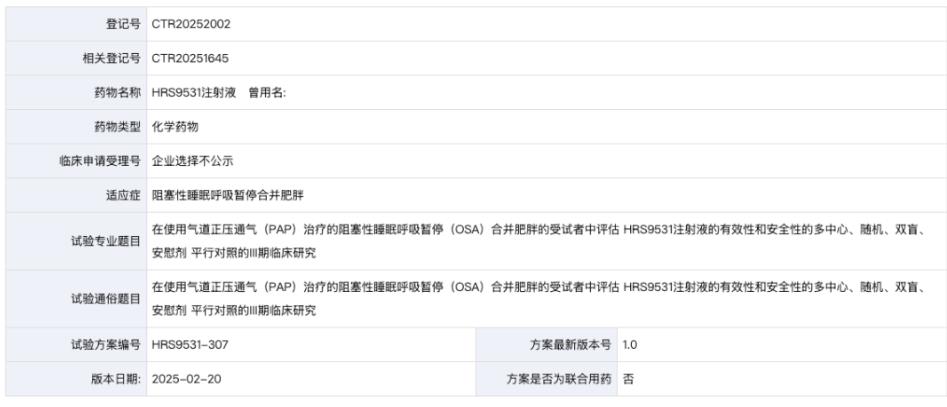 近日,藥物臨床試驗(yàn)登記與信息公示平臺(tái)官網(wǎng)顯示,恒瑞醫(yī)藥登記了一項(xiàng)在使用氣道正壓通氣(PAP)治療的阻塞性睡眠呼吸暫停(OSA)合并肥胖的受試者中評(píng)估 HRS9531 注射液的有效性和安全性的多中心、隨機(jī)、雙盲、安慰劑平行對(duì)照的 III 期臨床研究。