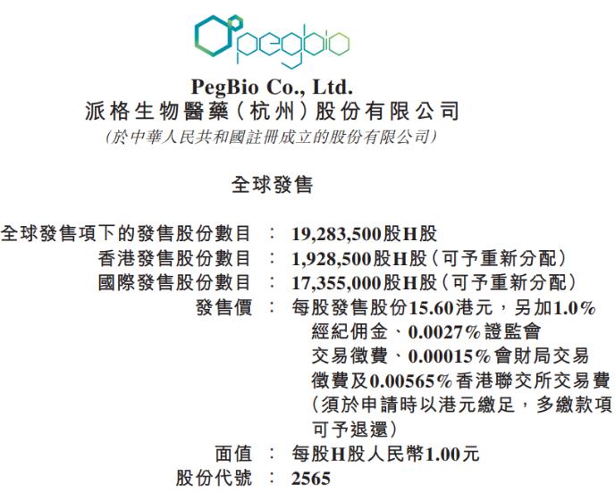 2025年5月27日,派格生物正式登陸港股,在聯(lián)交所上市。其發(fā)行價(jià)為15.6港元/股 ,按照發(fā)行價(jià)計(jì)算,對(duì)應(yīng)市值約60.2億港元。獨(dú)家保薦人為中金公司。