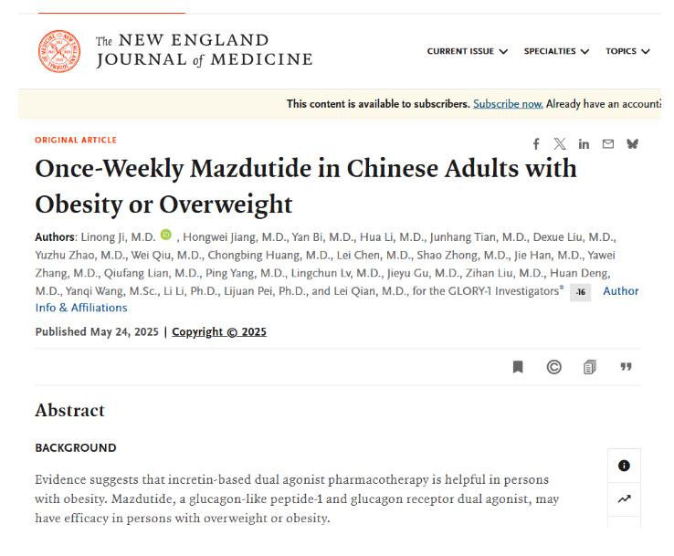 2025年5月26日,信達(dá)生物制藥集團(tuán)( 香港聯(lián)交所股票代碼:01801),一家致力于研發(fā)、生產(chǎn)和銷(xiāo)售腫瘤、自身免疫、代謝及心血管、眼科等重大疾病領(lǐng)域創(chuàng)新藥物的生物制藥公司,宣布:胰高血糖素(GCG)/胰高血糖素樣肽-1(GLP-1)雙受體激動(dòng)劑,瑪仕度肽,在中國(guó)超重或肥胖受試者中的III期臨床研究(GLORY-1)結(jié)果近日在國(guó)際知名期刊《新英格蘭醫(yī)學(xué)雜志》(The New England Journal of Medicine, NEJM)全文在線發(fā)表,并特配專(zhuān)家評(píng)述。本文第一作者分別為北京大學(xué)人民醫(yī)院紀(jì)立農(nóng)教授和河南科技大學(xué)附屬第一醫(yī)院姜宏衛(wèi)教授,另外紀(jì)立農(nóng)教授和信達(dá)生物制藥集團(tuán)錢(qián)鐳博士為本文共同通訊作者。