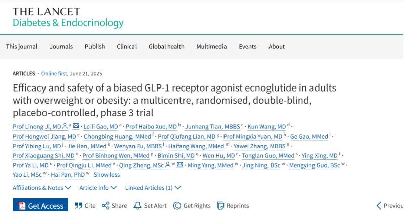 2025年6月22日,中國杭州和美國舊金山——杭州先為達(dá)生物科技股份有限公司(以下簡稱“先為達(dá)生物”),一家處于臨床階段、專注于發(fā)現(xiàn)和開發(fā)代謝性疾病創(chuàng)新療法的生物醫(yī)藥公司。今日宣布,埃諾格魯肽(Ecnoglutide,XW003,曾用名:伊諾格魯肽)在中國超重或肥胖成人中的Ⅲ期臨床試驗(yàn)(SLIMMER)結(jié)果,已正式發(fā)表于國際頂級(jí)期刊《柳葉刀·糖尿病與內(nèi)分泌學(xué)》(The Lancet Diabetes & Endocrinology),并同步在第85屆美國糖尿病協(xié)會(huì)(ADA)科學(xué)會(huì)議上進(jìn)行了口頭報(bào)告。研究顯示,作為全球首個(gè)cAMP偏向型GLP-1受體激動(dòng)劑,埃諾格魯肽在48周時(shí)實(shí)現(xiàn)了15.4%的平均體重降幅,92.8%的受試者體重降幅超過5%。