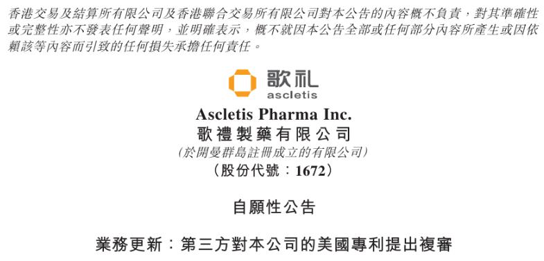 2025年6月30日,歌禮發(fā)布一則公告,宣布于6月24日獲悉由石藥集團附屬公司康久普樂(Conjupro Biotherapeutics)向美國專利商標局(USPTO)提交的一項復審(petition for Post Grant Review)。該復審質(zhì)疑歌禮一項已獲授權(quán)的美國專利(美國專利號:12,234,236)權(quán)利要求1-9、12-17及21-25的有效性。截至公告日期,該復審仍在USPTO審查中。