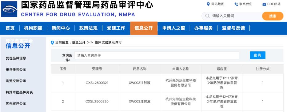 近日,CDE 官網(wǎng)顯示,先為達 XW003 注射液獲批臨床,用于 12~17 歲青少年肥胖患者體重管理。