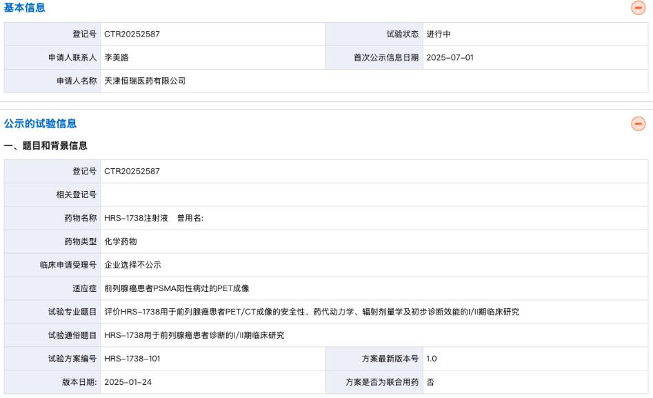 2025年7月1日,藥物臨床試驗登記與信息公示平臺官網(wǎng)顯示,恒瑞醫(yī)藥登記了一款評價 HRS-1738 用于前列腺癌患者 PET/CT 成像的安全性、藥代動力學、輻射劑量學及初步診斷效能的 I/II 期臨床研究(HRS-1738-101)。
