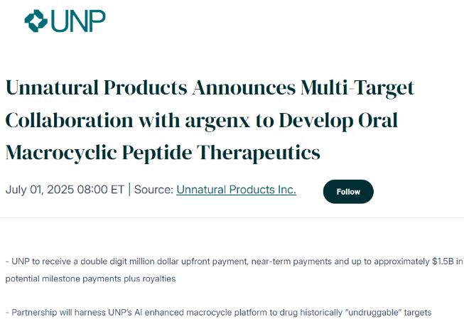 2025年7月1日,Unnatural Products(UNP),一家開發(fā)口服大環(huán)肽以解決以前不可成藥的靶點的生物技術(shù)公司,宣布與全球免疫學公司argenx進行戰(zhàn)略多靶點研究合作,以發(fā)現(xiàn)和開發(fā)針對傳統(tǒng)“不可成藥”疾病靶點的口服大環(huán)肽類藥物。2023年12月Unnatural Products(UNP)完成3200萬美元的A輪融資,2024年與默沙東達成2.2億美元合作。Unnatural Products(UNP)的平臺通過并行實驗和機器學習的結(jié)合,解決了大環(huán)領(lǐng)域藥物化學的復雜性。