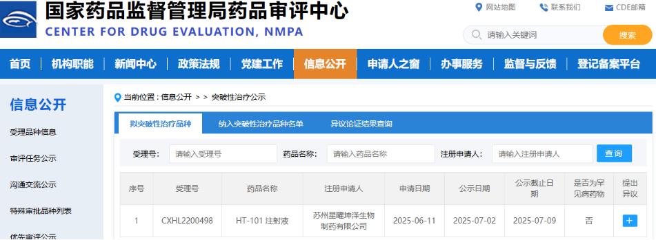 2025年7月2日,國家藥品監(jiān)督管理局藥品審評中心顯示星曜坤澤HT-101注射液擬納入突破性治療藥物,用于治療慢性乙肝病毒感染。
