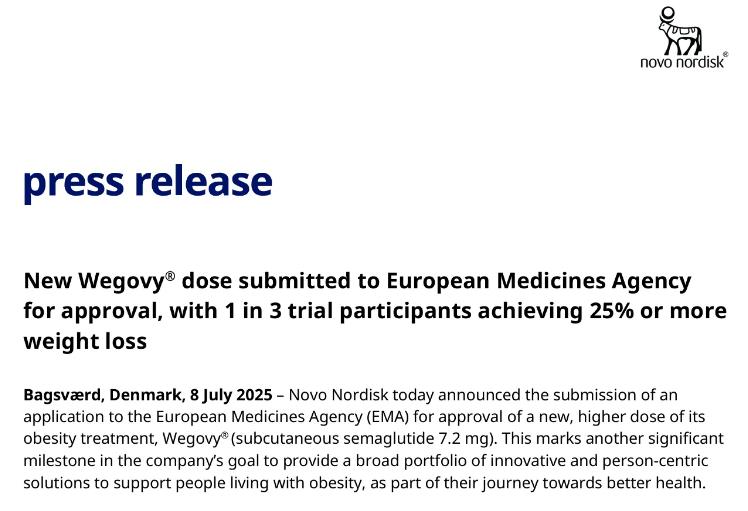 2025年7月8日,諾和諾德宣布7.2mg司美格魯肽的上市申請獲得歐洲藥品管理局(EMA)受理,用于體重管理。