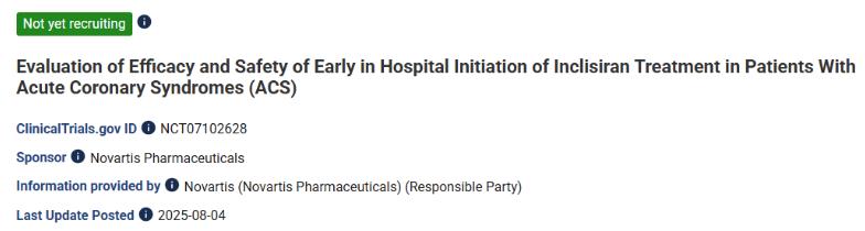 2025年8月4日,ClinicalTrials.gov 官網(wǎng)顯示,諾華登記了一項英克司蘭鈉的 III 期臨床,旨在評估急性冠狀動脈綜合征(ACS)患者住院早期開始英克司蘭鈉治療的療效和安全性。