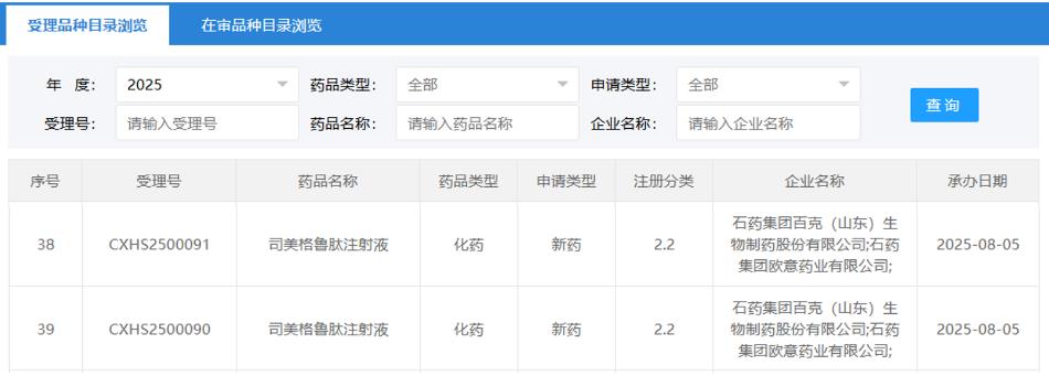 2025年8月5日,國家藥品監(jiān)督管理局(NMPA)藥品審評中心(CDE)官網(wǎng)顯示,石藥集團(tuán)的司美格魯肽注射液上市申請已獲受理。