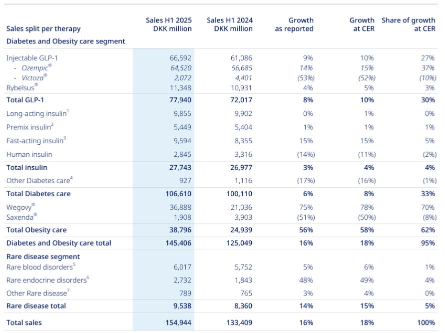 2025年8月6日,諾和諾德公布2025H1業(yè)績,上半年總營收1549.44億丹麥克朗(約合229.26億美元,按今年平均匯率:1丹麥克朗= 0.14796美元計算,下同),同比增長18%(按固定匯率CER計算)。