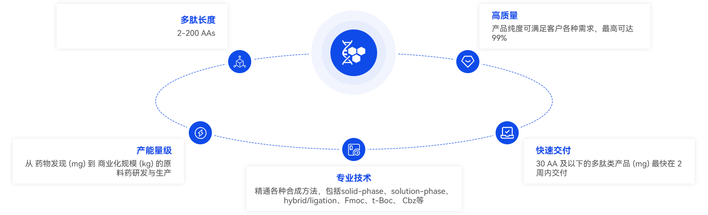 多肽修飾技術(shù)在改變肽鏈結(jié)構(gòu)和側(cè)鏈基團(tuán)方面發(fā)揮著重要作用,可以有效地改善多肽的理化性質(zhì),例如改善水溶性、增加穩(wěn)定性、提高生物活性、延長體內(nèi)作用時(shí)間等。我們的多肽修飾和偶聯(lián)平臺PeptiConjuX? 融合了最新的多肽特殊修飾技術(shù), 包括專有的樹脂上環(huán)化 (on resin cyclization)、N-甲基化修飾、磷酸修飾、糖基化修飾、多形態(tài)PEG修飾等技術(shù),特別是對復(fù)合抗原多肽(MAPs)、環(huán)肽 (例如:酰胺鍵、單硫醚鍵和連二硫醚鍵構(gòu)成的單環(huán)肽、Stapled Peptide、雙環(huán)肽和三環(huán)肽) 、多個(gè)二硫鍵 (Multiple disulfide bonds)等的修飾,居行業(yè)領(lǐng)先地位。在這個(gè)平臺上,我們打造了一套成熟的偶聯(lián)、熒光、生物素、酰氨化等標(biāo)記工藝,產(chǎn)品開發(fā)涉及免疫、腫瘤、基因等多個(gè)研究領(lǐng)域,目前,我們的標(biāo)記種類已突破了40種,為客戶提供了更多選擇。我們的平臺也為客戶提供了多種多肽偶聯(lián)藥物 (Peptide-Drug Conjugates, PDCs) 創(chuàng)新分子的定制開發(fā)服務(wù),包括Peptide-Radionuclide Conjugates, Peptide-toxin Conjugates, Peptide-Oligo Conjugates, Peptide-Antibody Conjugates等。