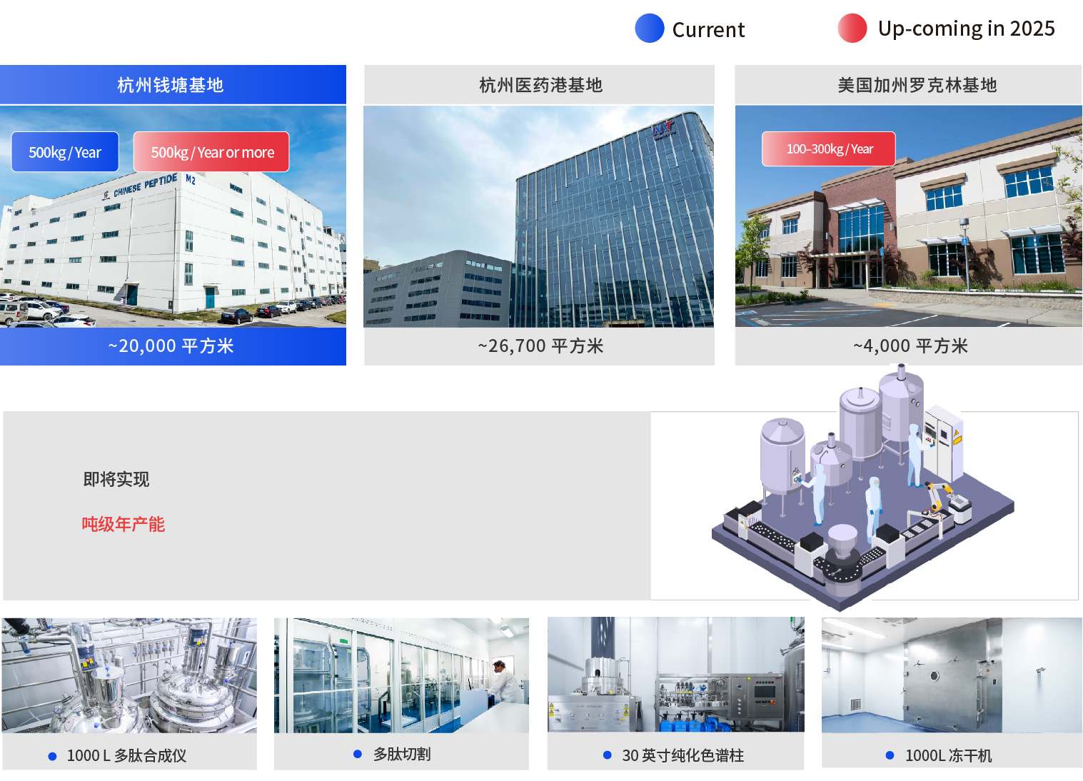 我們擁有符合全球法規(guī)的大規(guī)模藥品生產(chǎn)質(zhì)量管理規(guī)范(GMP)生產(chǎn)能力,在中美兩地建有3個生產(chǎn)基地,保證全球原料供應的高效和安全。在 杭州錢塘廠區(qū),我們建有19條20L至1,000L的多肽合成生產(chǎn)線,以及16條純化生產(chǎn)線。多肽API年產(chǎn)能500千克,每批產(chǎn)能為20千克,能夠處理多個100千克級的采購訂單。錢塘廠區(qū)擁有 1000L多肽合成儀、1000L凍干機 以及 30英寸純化色譜柱 等行業(yè)領先設備,確保高效生產(chǎn)和高純度產(chǎn)品。展望 2025年,錢塘廠區(qū)將新增 7條合成產(chǎn)線 和 4條純化產(chǎn)線,進一步提升我們的服務能力和市場競爭力。隨著在建的 杭州醫(yī)藥港基地 和 美國加州羅克林基地 的逐步落成,我們的產(chǎn)能將大幅提升至 噸級,為全球客戶提供更強大的生產(chǎn)保障和靈活支持。