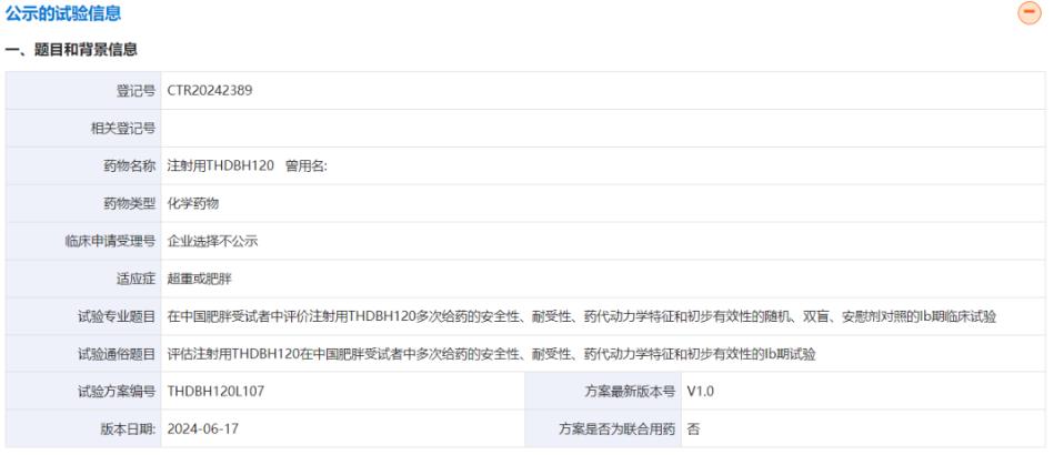 近日,藥物臨床試驗登記與信息公示平臺顯示,通化東寶針對THDBH120啟動了一項隨機、雙盲、安慰劑對照的Ib期試驗(CTR20242389)。該研究旨在評估THDBH120在中國肥胖受試者中多次給藥的安全性、耐受性、藥代動力學(xué)特征和初步有效性。
