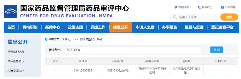 2024年7月9日,蘇州圣因生物醫(yī)藥有限公司(以下簡稱“圣因生物”)宣布,與信達生物制藥集團共同開發(fā)的用于治療高血壓的小核酸(siRNA)藥物SGB-3908注射液臨床試驗申請已獲得國家藥品監(jiān)督管理局藥品審評中心(CDE)臨床試驗申請默示許可(受理號:CXHL2400426),用于治療高血壓。這是圣因生物繼SGB-3403注射液、SGB-9768注射液之后在國內(nèi)申請開展臨床試驗的第三款siRNA藥物。