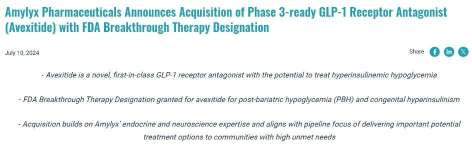 2024年7月10日,Amylyx Pharmaceuticals宣布收購Eiger BioPharmaceuticals的在研療法Avexitide。Avexitide迄今已被研究用于治療高胰島素性低血糖。Amylyx公司預(yù)計在2025年第一季度開展3期臨床試驗,評估avexitide治療術(shù)后低血糖(PBH)的效果。