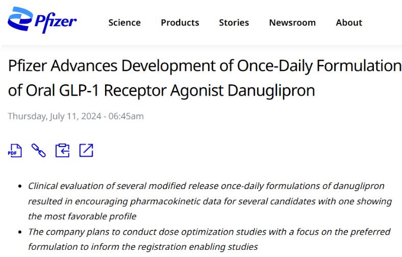 2024年7月11日,輝瑞宣布根據(jù)正在進行的藥代動力學(xué)研究(NCT06153758)的結(jié)果,已經(jīng)確定了口服GLP-1R激動劑Danuglipron(PF-06882961)每日1給藥的優(yōu)選緩釋制劑配方。此外,輝瑞計劃在2024年下半年啟動該緩釋制劑的劑量優(yōu)化研究以評估多個劑量的療效和安全性,為注冊性研究提供參考。