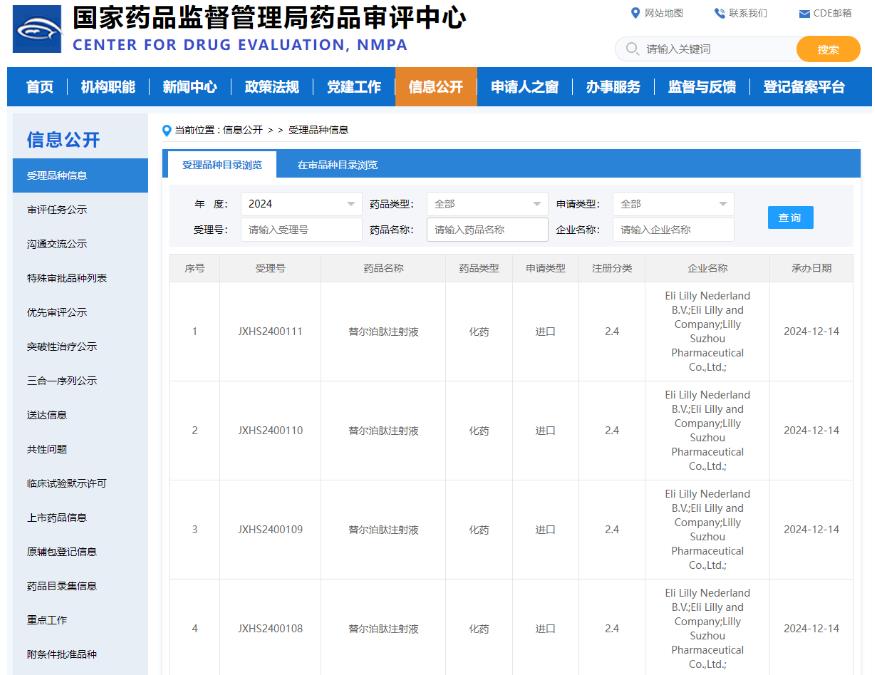 2024年12月14日,中國(guó)國(guó)家藥監(jiān)局藥品審評(píng)中心(CDE)網(wǎng)站最新公示,禮來(lái)(Eli Lilly and Company)重磅藥物GIP/GLP-1受體雙重激動(dòng)劑替爾泊肽注射液新適應(yīng)癥上市申請(qǐng)獲得受理,具體適應(yīng)癥尚未披露。根據(jù)CDE官網(wǎng)查詢,這是替爾泊肽在中國(guó)遞交的第五項(xiàng)上市申請(qǐng),其中兩項(xiàng)上市申請(qǐng)此前已經(jīng)獲NMPA批準(zhǔn)。