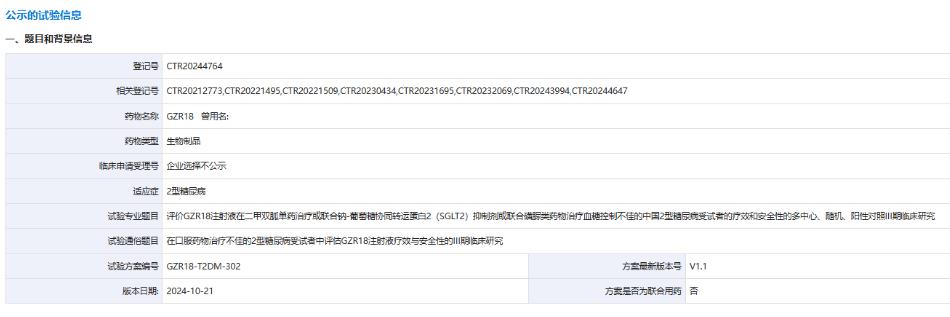 GZR18注射液是甘李藥業(yè)開(kāi)發(fā)的一款注射頻率為每周1次(QW)或每2周1次(Q2W)的GLP-1R激動(dòng)劑。2021年10月22日,GZR18首次獲國(guó)家藥監(jiān)局批準(zhǔn)開(kāi)展臨床試驗(yàn)。2023年6月,GZR18被推進(jìn)至II期階段。今年12月11日,繼在降糖和減肥適應(yīng)癥中均取得II期積極結(jié)果后,GZR18被推進(jìn)至III期階段。